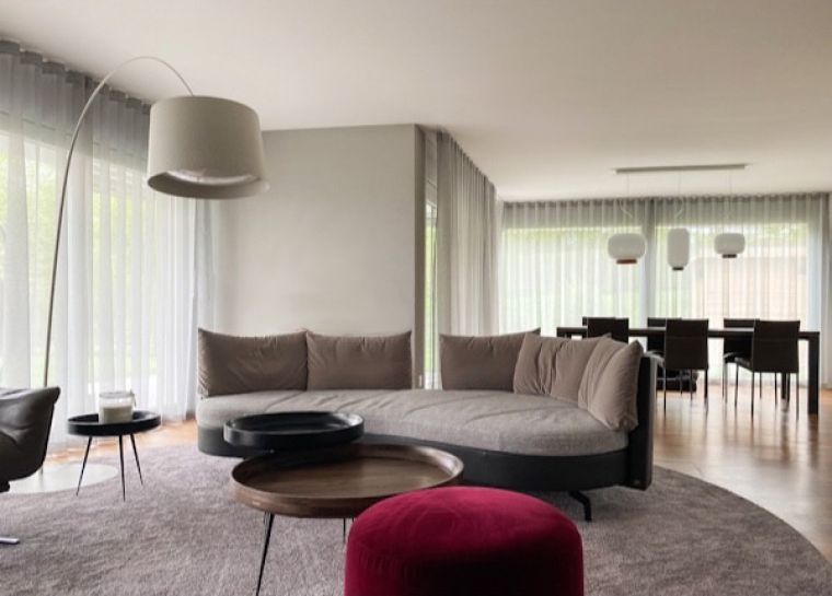 Bei einem ganz anderen Projekt galt es ein privates Wohnzimmer in St.Gallen umzugestalten. Doris Schranz erläutert: «Das Wohnzimmer ist Treff- und Angelpunkt im Hause dieser Familie. Ganz in diesem Sinn war die Ausrichtung der gestalterischen Anpassung für diese Räumlichkeiten gewünscht.» Die Neugestaltung umfasste den Wohn- und Essbereich und sollte in einem grosszügigen und modernen Kontext sorgfältig umgesetzt werden. Da ein Kaminanschluss vorhanden war, galt es, ein Cheminée einzuplanen sowie Möblierung, Materialien, Farben und die Raumaufteilung zu definieren.