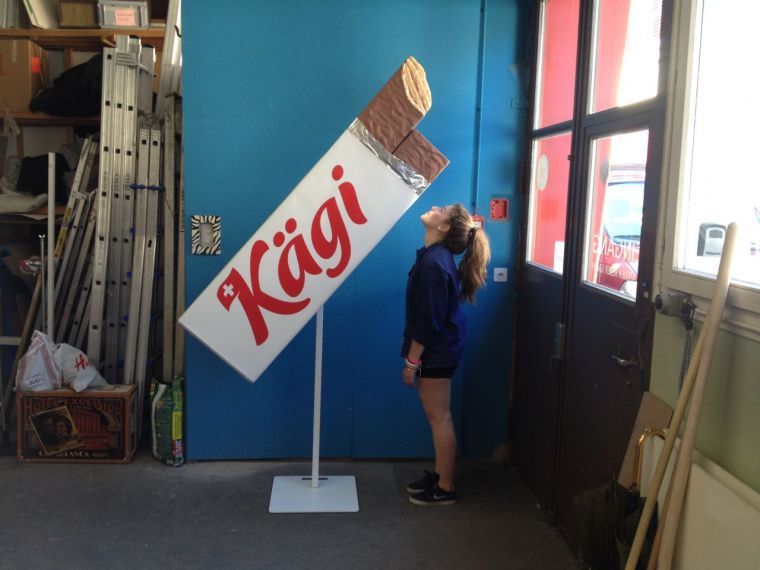 Das fünfköpfige Team besteht denn auch aus zwei Lernenden und wird regelmässig von drei Freelancerinnen unterstützt. Einerseits arbeiten die Polydesigner3D viel auswärts, aber die Vorbereitungen nehmen sie inhouse vor. «Wir sind bestens ausgerüstet mit einem Maschinenpark für Holz-, Metall-, Kunststoff- und Malarbeiten, zudem lässt unser grosses Lager an Gestaltungsmaterialien fast keine Wünsche offen», berichtet der Inhaber stolz. So war das Team auch gut gewappnet für die Entwicklung eines riesigen, portablen Kägifrets, das die Firma Kägi aus Lichtensteig zum Ausstellen an Messeständen und Events wünschte. Es galt also, ein robustes und dennoch flexibles, für verschiedene Einsätze geeignetes Modell zu erstellen, das insbesondere authentisch und frisch aussehen sollte – zum Reinbeissen halt. Die Umsetzung des vorderen Bissteils schlussendlich eine besondere Herausforderung und entsprechend aufwändig.