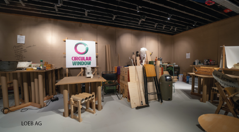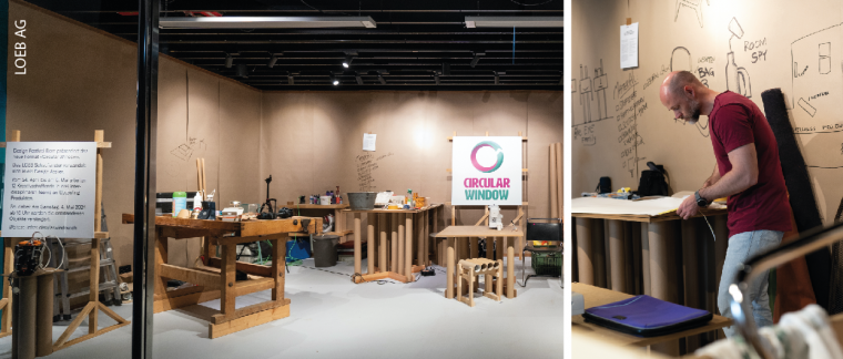 Das LOEB-Schaufenster wurde während des Design Festivals nicht wie üblich nach sorgfältig ausgearbeiteten Plänen gestaltet, sondern live vor Ort zum Leben erweckt. An verschiedenen Arbeitsplätzen schmiedeten drei exklusiv für das Festival zusammengestellten Designteams während 12 Tagen Ideen, erschufen innovative Kreationen und setzten Visionen um. Besonders wichtig dabei: Nachhaltigkeit.